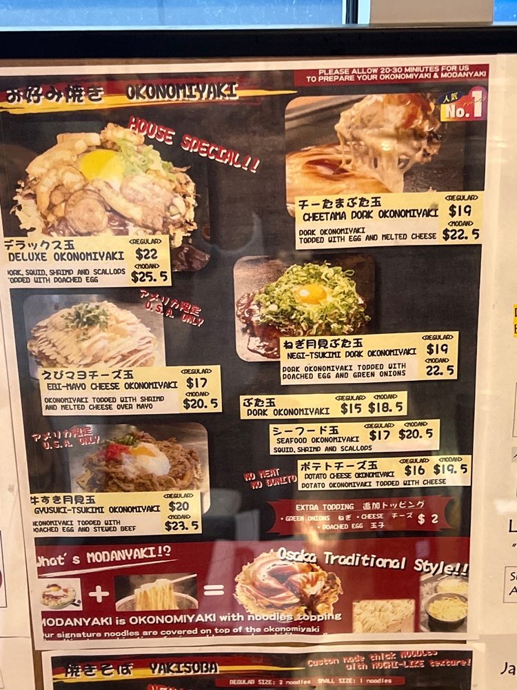 Everything okonomiyaki on top of crispy noodle layer. Includes pork, squid, shrimp and scallops topped with fried egg, served with house special sauce and mayo